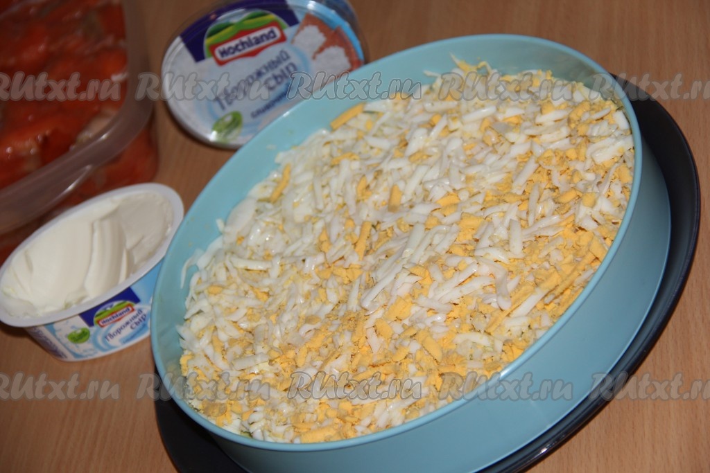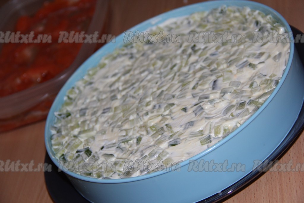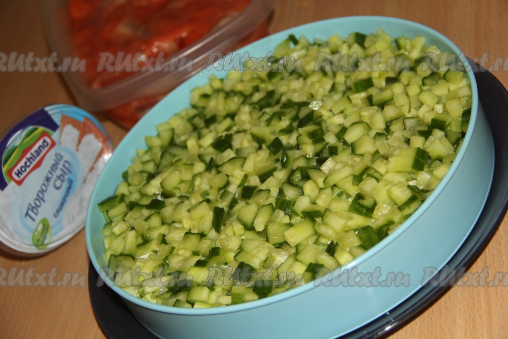Огурцы, порезанные мелким кубиком, выложить поверх яиц.