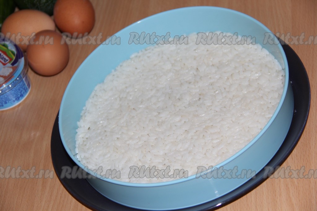 Рис отварить до готовности в подсоленной воде, остудить. Яйца сварить вкрутую, остудить и почистить. На дно плоской тарелки поставить бортики для формирования закусочного торта. Выложить рис, разровнять и смазать майонезом.