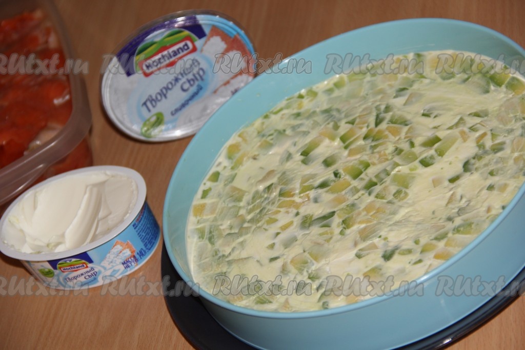 Смазать слой огурцов сливочным сыром, слегка прижимая.
