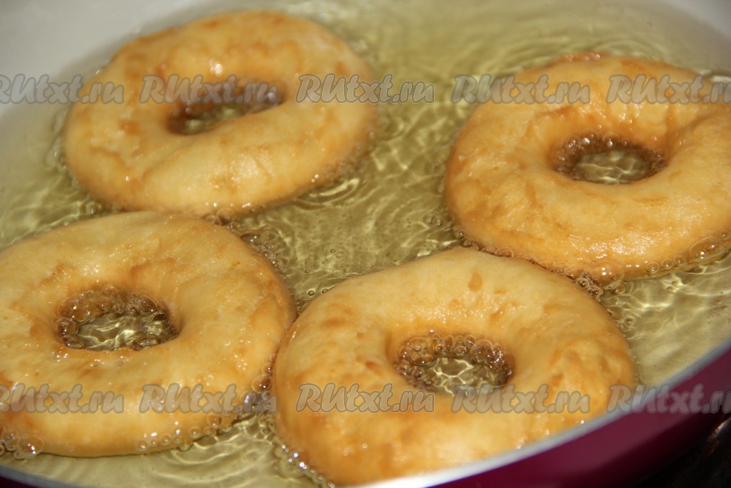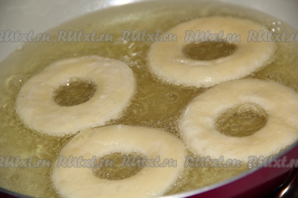 В сковороде с высокими бортиками или в сотейнике разогреть растительное масло, аккуратно опустить в масло пончики.