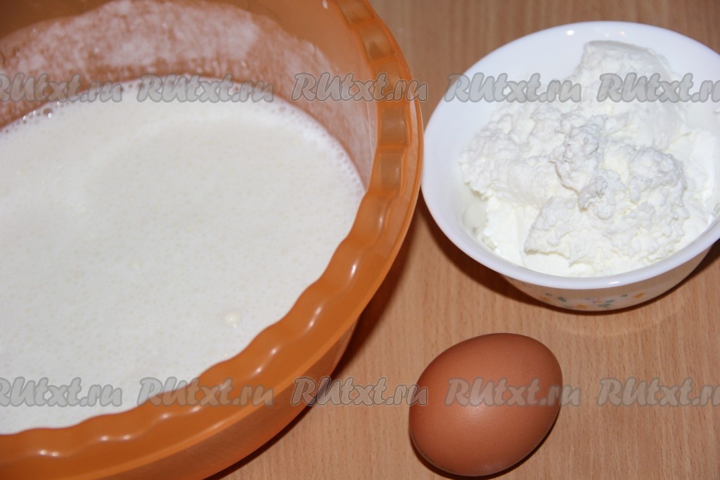 Затем в кефир добавить яйцо, творог, сахар, растительное масло, соль и тщательно перемешать.