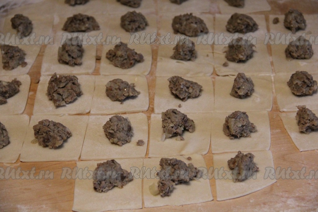 Тесто раскатать в пласт и нарезать квадратиками. На серединку теста выложить нашу начинку.