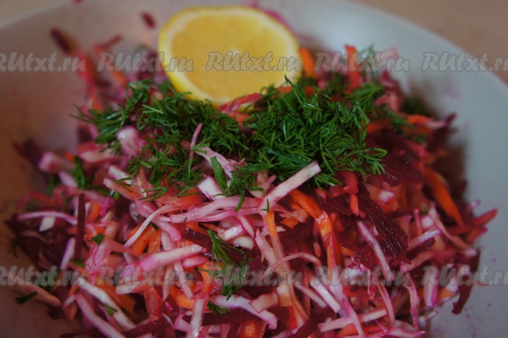 К свекле, капусте и моркови добавляем нарезанный укроп, соль, чёрный молотый перец, воду (для сочности), выдавливаем 1 столовую ложку лимонного сока и перемешиваем. Ставим салат "Щётка" на 20-30 минут в холодильник, чтобы он пропитался и стал более сочным.