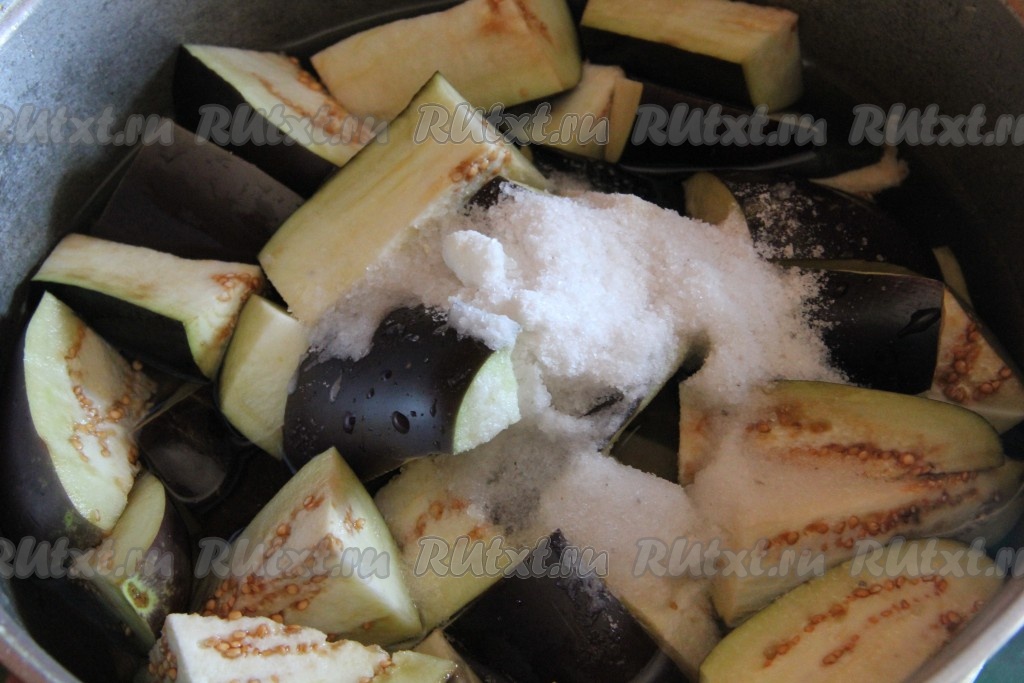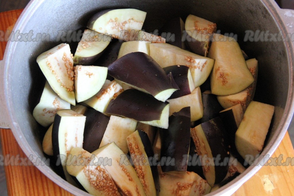 Отправить на огонь и отварить до мягкости баклажанов, примерно 3-5 минут после закипания. С готовых баклажанов слить воду.