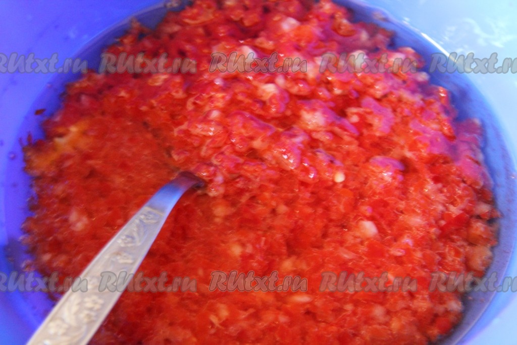 Для заливки перекрутить на мясорубку красный болгарский перец, острый перец и чеснок. Добавить уксус и растительное масло, перемешать. Острая заливка для баклажанов готова.
