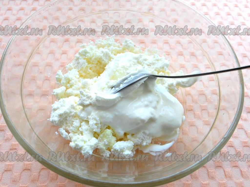 Творог для начинки можно взять любой жирности. Сметану тоже можно взять любой жирности (я купила жирностью 20%). Выложить творог в миску, добавить сметану, растереть вилкой до однородности.