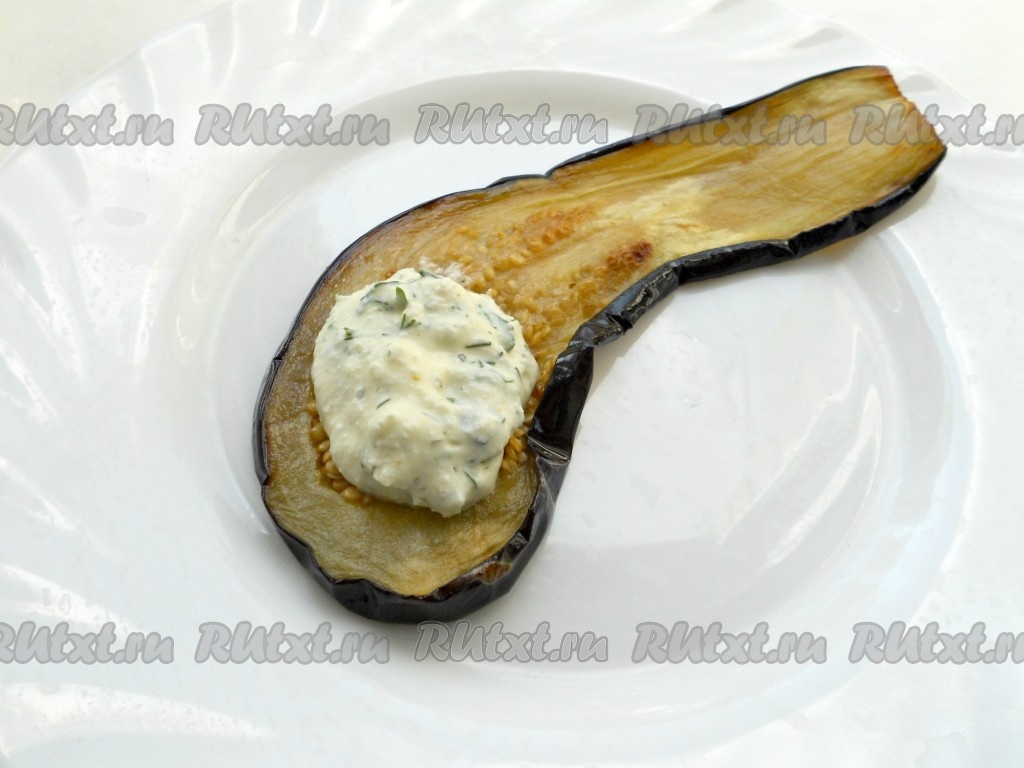 На широкую сторону остывшей пластины баклажана, немного отступив от краёв, поместить 1 чайную ложку начинки из творога и чеснока. Начиная со стороны с начинкой, свернуть баклажан в рулетик.