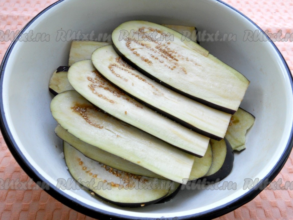 Баклажаны помыть, удалить хвостики. Нарезать баклажаны вдоль на тонкие пластины (ориентировочно толщина пластин должна быть 3-4 миллиметра), посыпать солью и оставить на 30 минут.