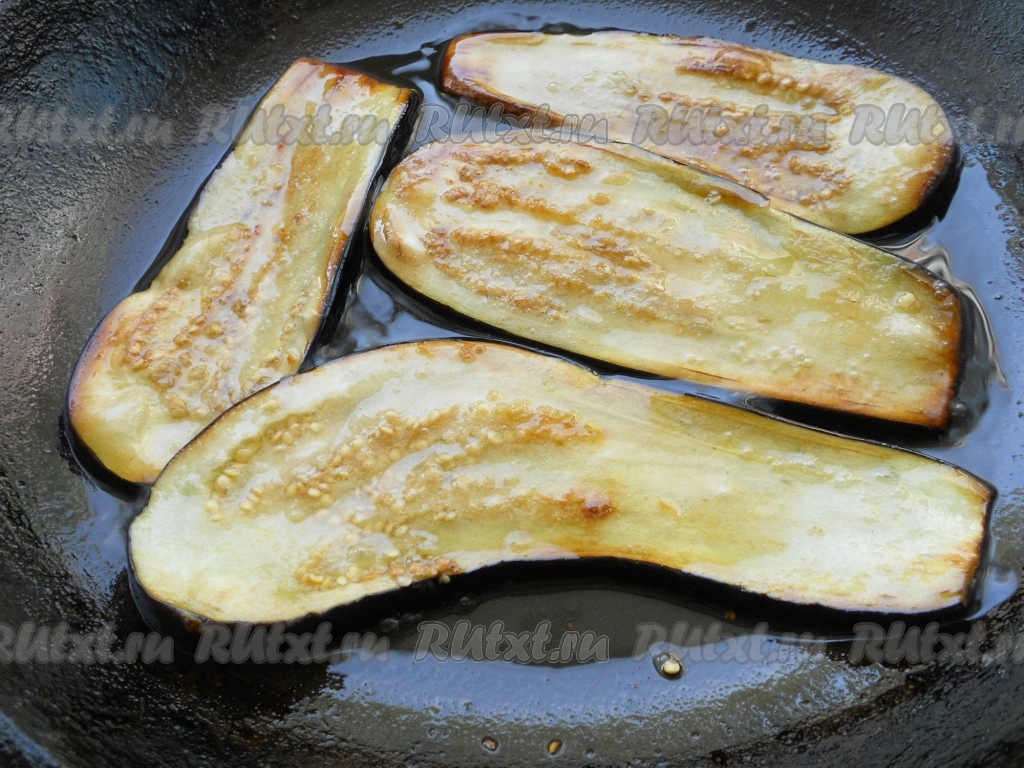 По прошествии 30 минут пластины баклажанов промыть водой, обсушить бумажным полотенцем. В сковороде разогреть растительное масло, уменьшить огонь до среднего, выложить несколько пластин баклажанов. Обжарить баклажаны с двух сторон до чуть золотистой корочки.
