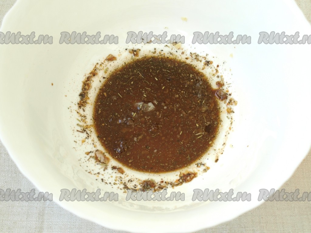 В глубокой миске смешать соевый соус, подсолнечное масло, соль, специи по вкусу (я брала для курицы) и выдавить чеснок.