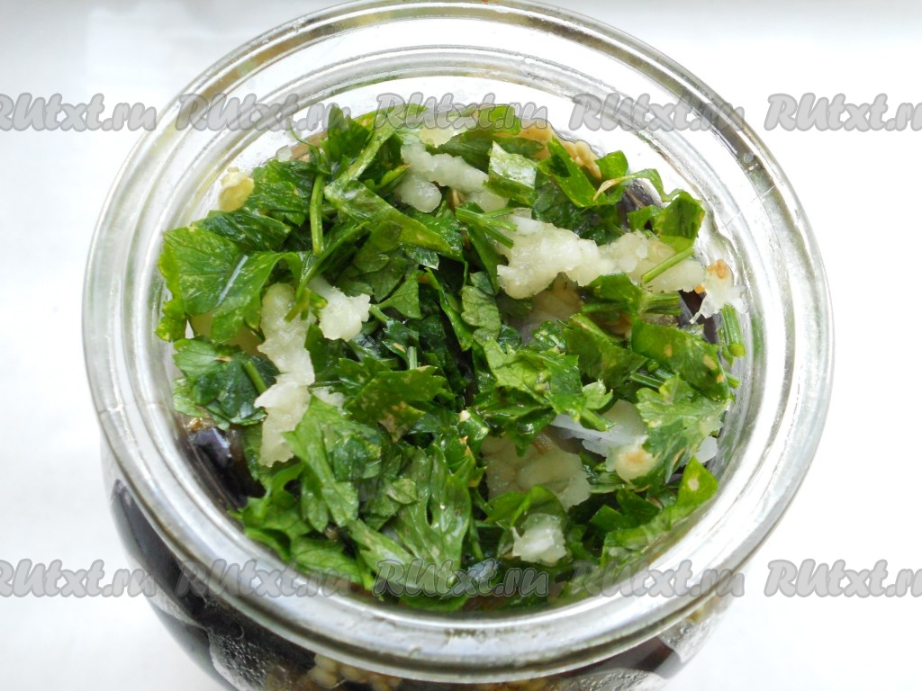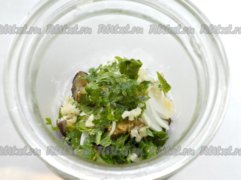 Пересыпать каждый слой баклажанов порезанным полукольцами репчатым луком, измельченной петрушкой и пропущенным через пресс чесноком. По желанию - горьким перцем.
