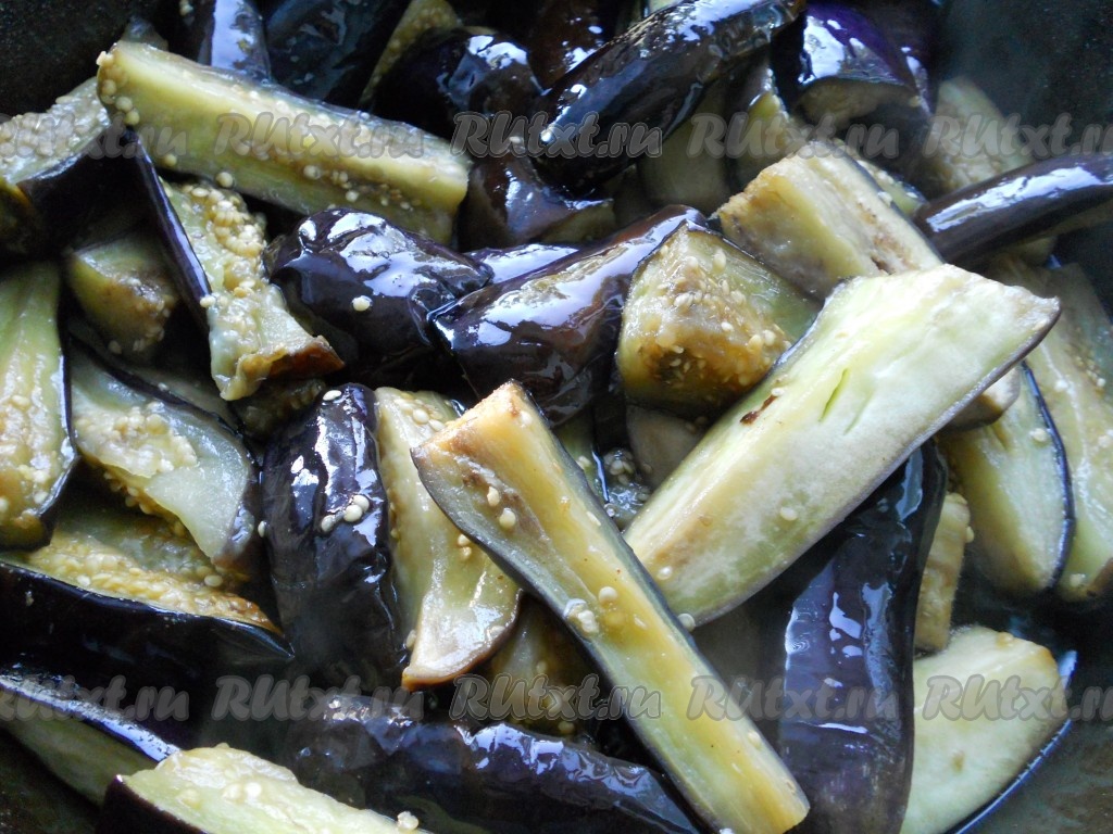 Баклажаны немного отжать и обжарить на растительном масле минут 10-15, несколько раз перемешав. Не пережаривайте, кусочки баклажанов должны быть не сырыми, но и остаться целенькими.