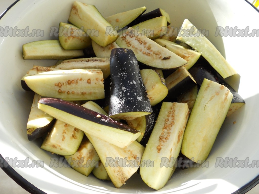 Баклажаны порезать крупными кусочками вдоль или кружками. Хорошо посолить и оставить на 30-40 минут.