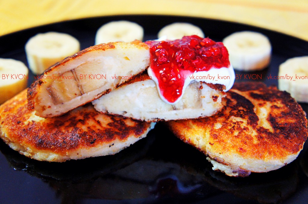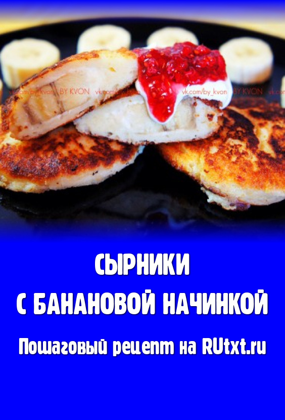 Вкусные, пышные, очень аппетитные сырники с банановой начинкой подаём к столу горячими, дополнив сметаной, вареньем или фруктами. Такое блюдо несомненно понравится и деткам, и взрослым!