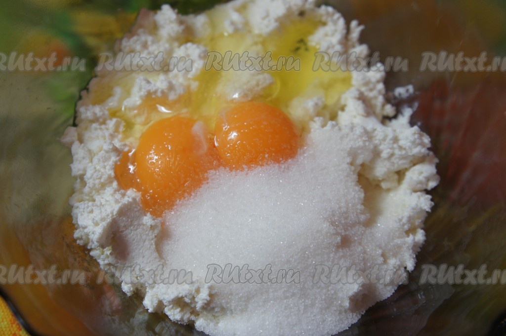 Творог выложить в миску, размять вилкой, добавить яйца и сахар.