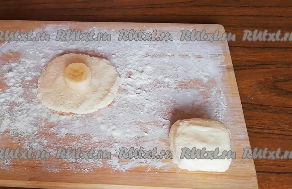 На хорошо припылённой мукой рабочей поверхности из части творожного теста сделать небольшую лепёшку. В центр лепёшки выложить кружочек банана, затем поднять края теста над бананом и сформировать сырник (то есть банан должен быть внутри сырника). Таким образом сформировать все сырники из творога с банановой начинкой.