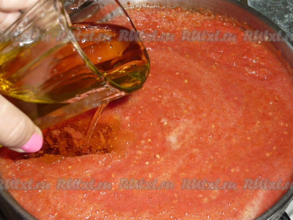 Добавить сахар, соль и растительное масло. Поставить на огонь и варить на медленном огне в течение 30 минут. Если хотите более густую аджику, варить нужно около часа.