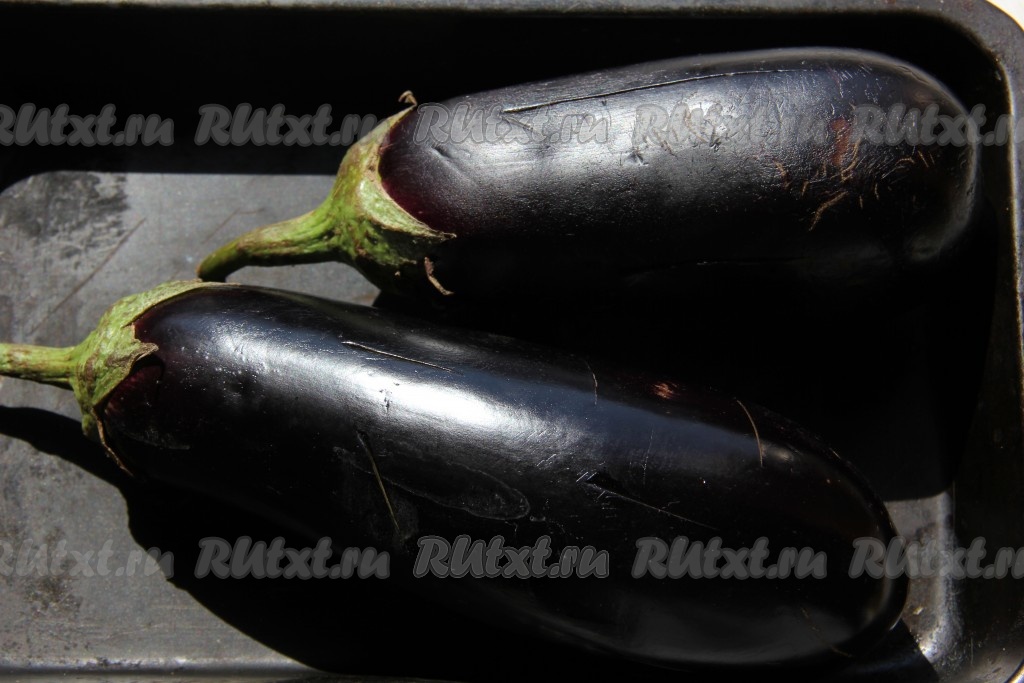 Баклажаны надрезать в нескольких местах и запечь в в разогретой духовке при температуре 180 градусов в течение 40 минут.