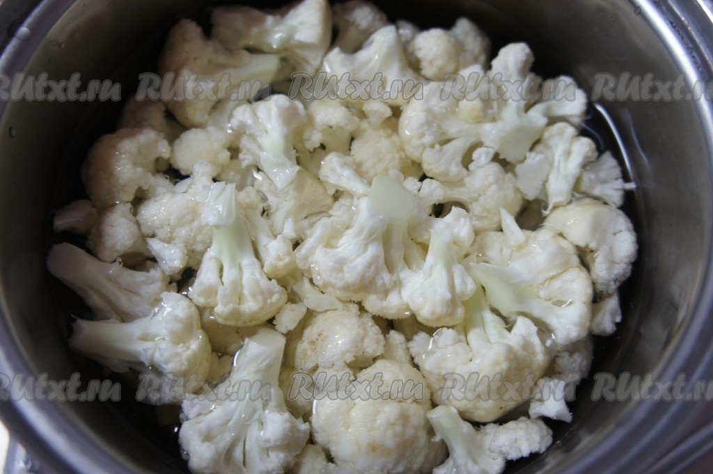 Цветную капусту промыть водой, разделить на соцветия. Переложить соцветия цветной капусты в кастрюлю, залить водой так, чтобы вода полностью покрыла капусту, поставить на сильный огонь. После закипания воды, добавить соль, уменьшить огонь, варить капусту минут 7-9 (цветная капуста должна стать мягкой, можно даже слегка переваренной).