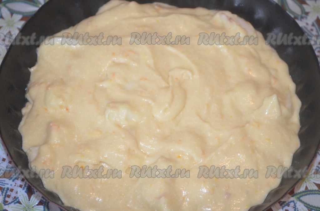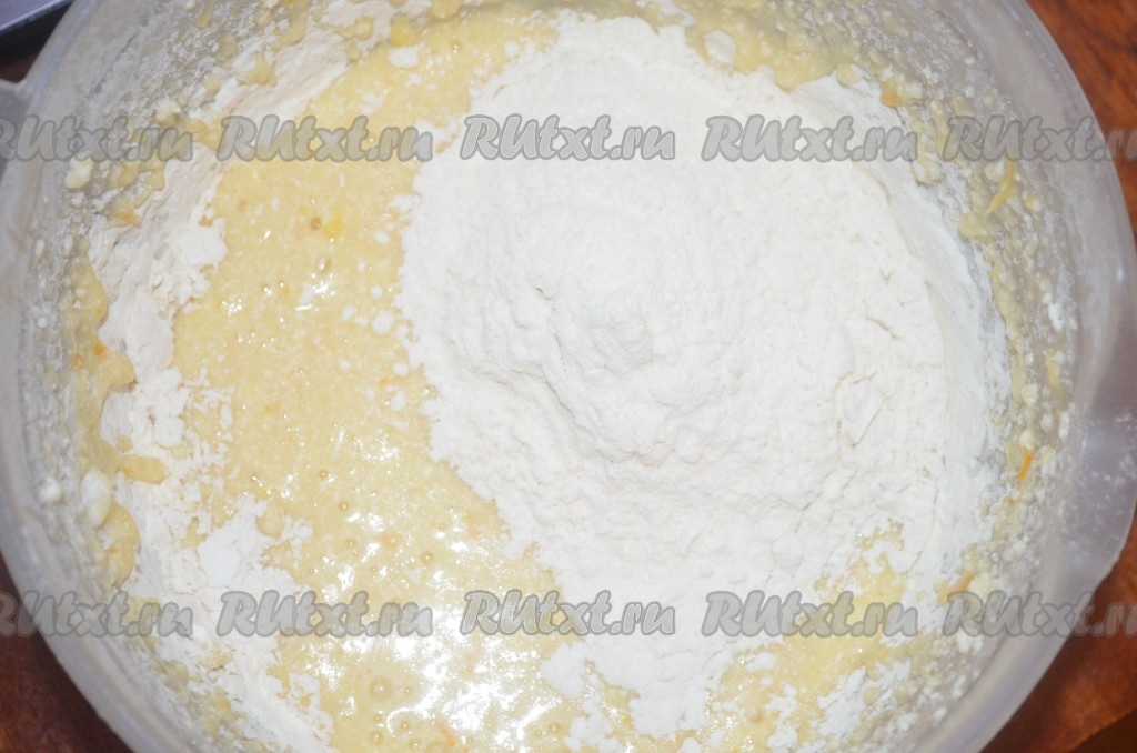 Просеять в тесто 150 грамм муки с разрыхлителем, перемешать ложкой (или лопаткой). Частями добавляя оставшуюся муку, замесить однородное, в меру густое тесто, напоминающее сметану средней жирности.