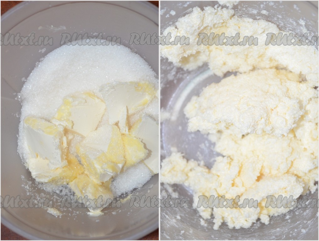 Сливочное масло для замешивания теста должно быть мягким (то есть комнатной температуры), поэтому его заранее нужно достать из холодильника, чтобы оно согрелось. Масло комнатной температуры выложить в ёмкость, в которой будет удобно взбивать миксером, всыпать сахар. Взбить масло с сахаром миксером в течение 3 минут.