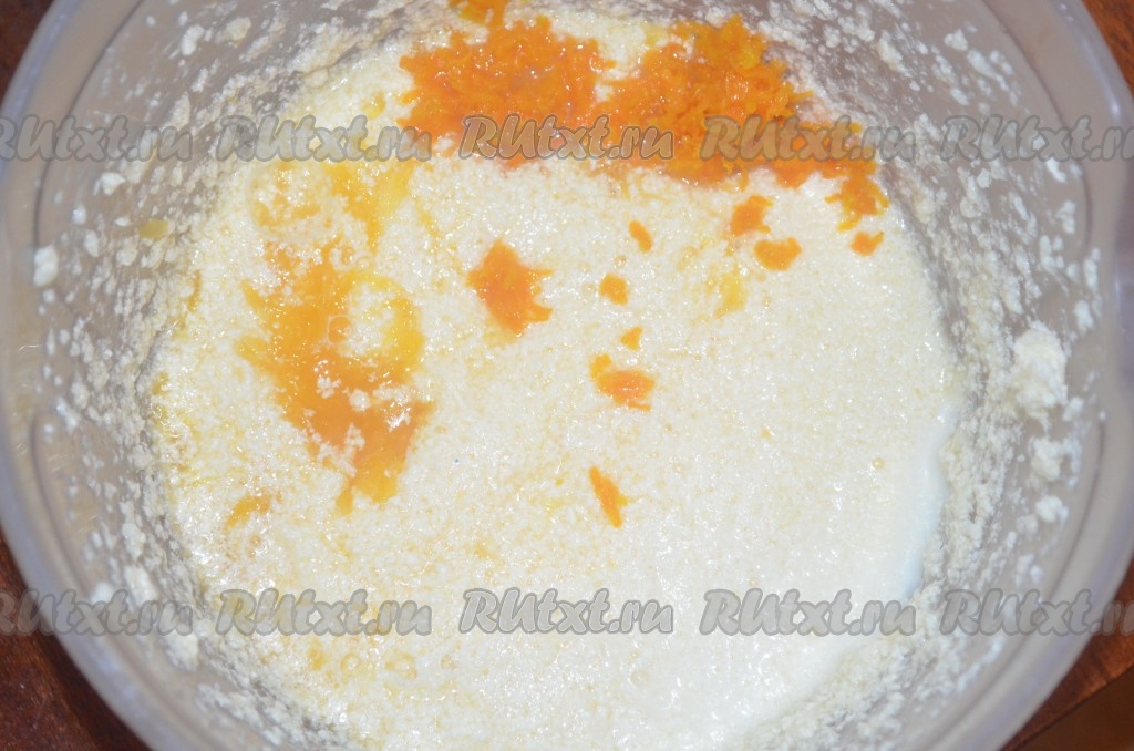 В смесь масла и яиц влить апельсиновый сок, молоко, добавить цедру, перемешать столовой ложкой (или лопаткой).