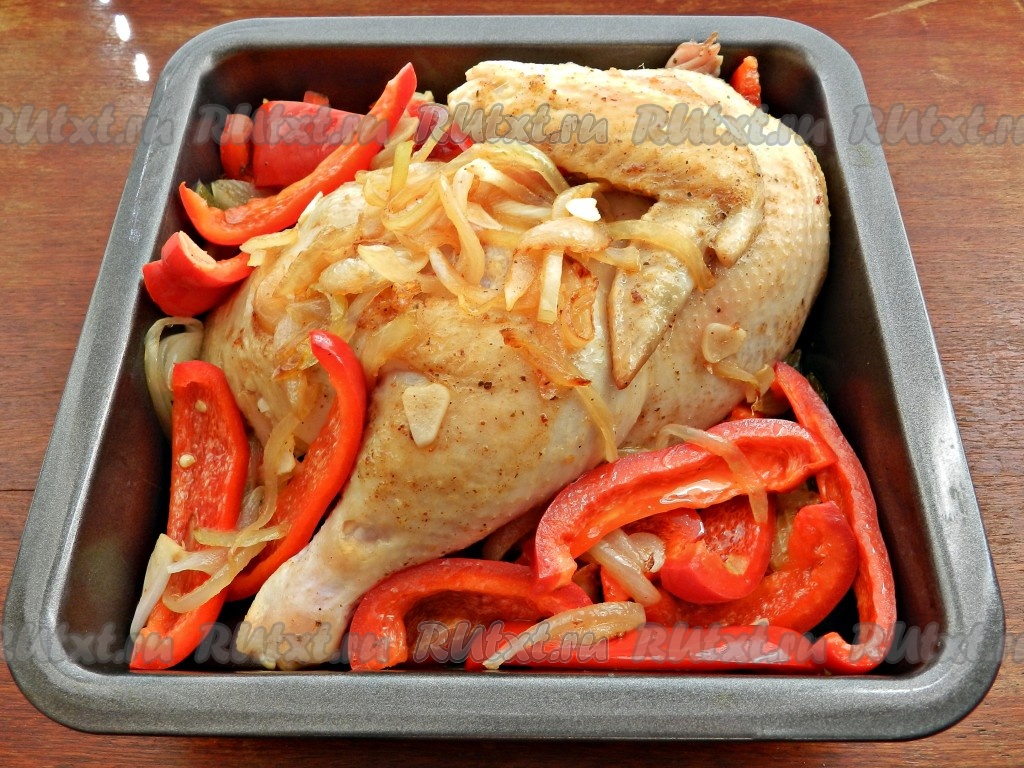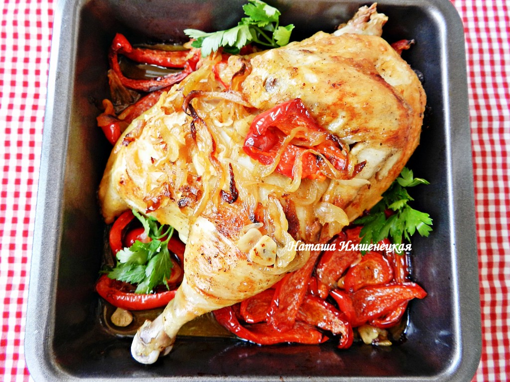 Форму для запекания смазать маслом, затем на дно выложить большую часть обжаренного лука. Поверх "подушки" из лука выложить половину курицы кожей вверх. Поверх курицы выложить оставшиеся лук с чесноком. Если у вас есть свежие овощи (болгарский перец, кабачок и т.д.), то их можно выложить рядом с курочкой. Я выложила очищенный от семян и нарезанный достаточно крупно болгарский перец. Поставить форму с половиной курицы в разогретую до 180 градусов духовку на 50-60 минут. В процессе запекания следите, чтобы мясо не начало подгорать. Если необходимо, то прикройте форму с курицей сверху фольгой. Готовность проверьте, сделав ножом надрез на курице (если выделяется прозрачный сок без примесей крови, значит курочка готова).