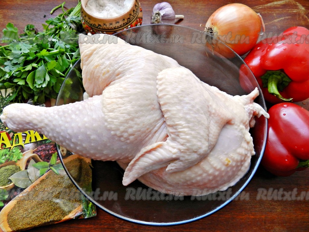 Подготовить продукты. Если у вас целая курица, то разрежьте её пополам.