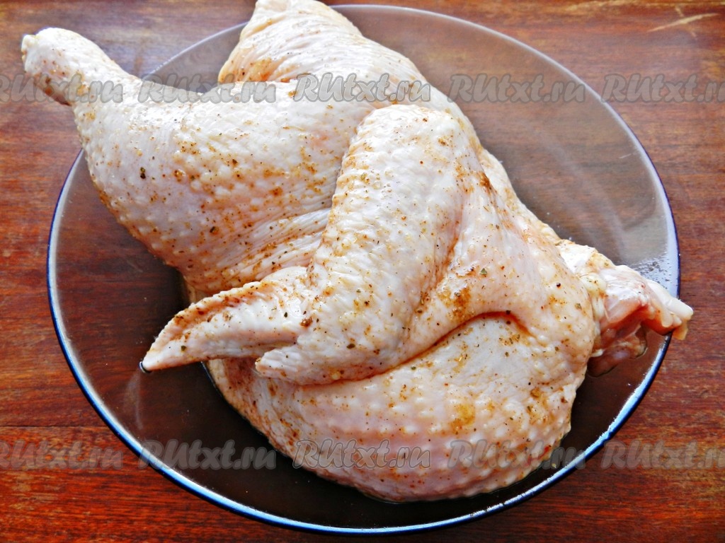 Половинку тушки курицу вымыть, натереть солью и специями со всех сторон, оставить на 1 час (можно поставить в холодильник и на более длительное время), чтобы мясо хорошо просолилось и пропиталось специями.