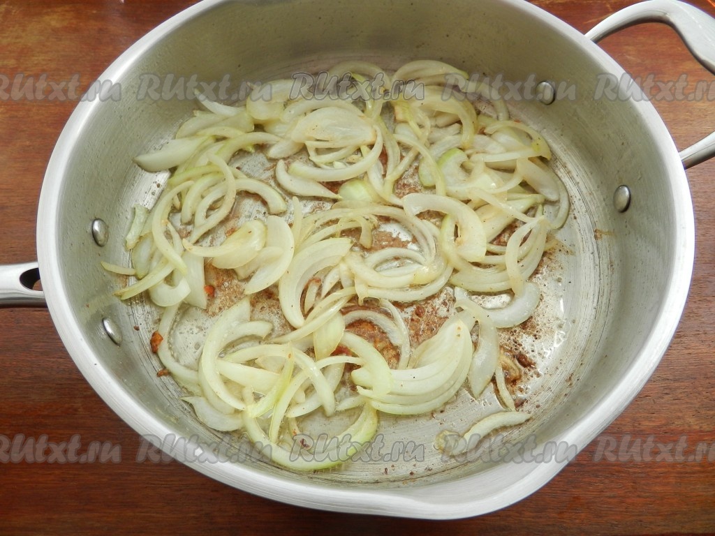 Лук и зубчики чеснока очистить. В сковороду влить растительное масло, хорошо разогреть и выложить нарезанный полукольцами лук. Обжарить лук на среднем огне, помешивая, до прозрачности, затем добавить рубленный чеснок, обжарить на небольшом огне в течение 1 минуты и убрать с огня.