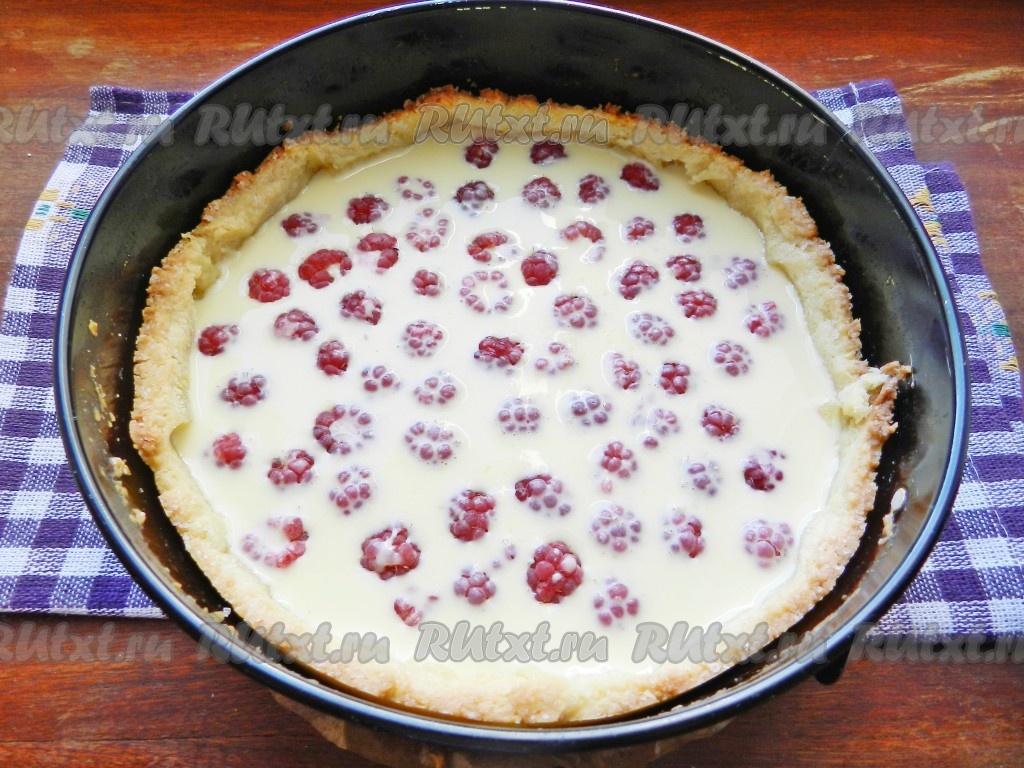 Сверху залить смесью из сливок и шоколада (или сгущёнки). Поставить в духовку, нагретую до 160 градусов, выпекать пирог с заливкой из сливок с ягодами 35 минут.