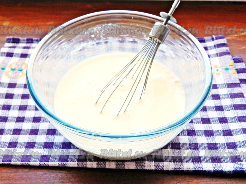 Вскипятить сливки, вылить в миску с шоколадом (или сгущёнкой) и размешать до полного растворения шоколада (смесь должна стать однородной). Остудить смесь, добавить яйца, взбить венчиком до однородности.