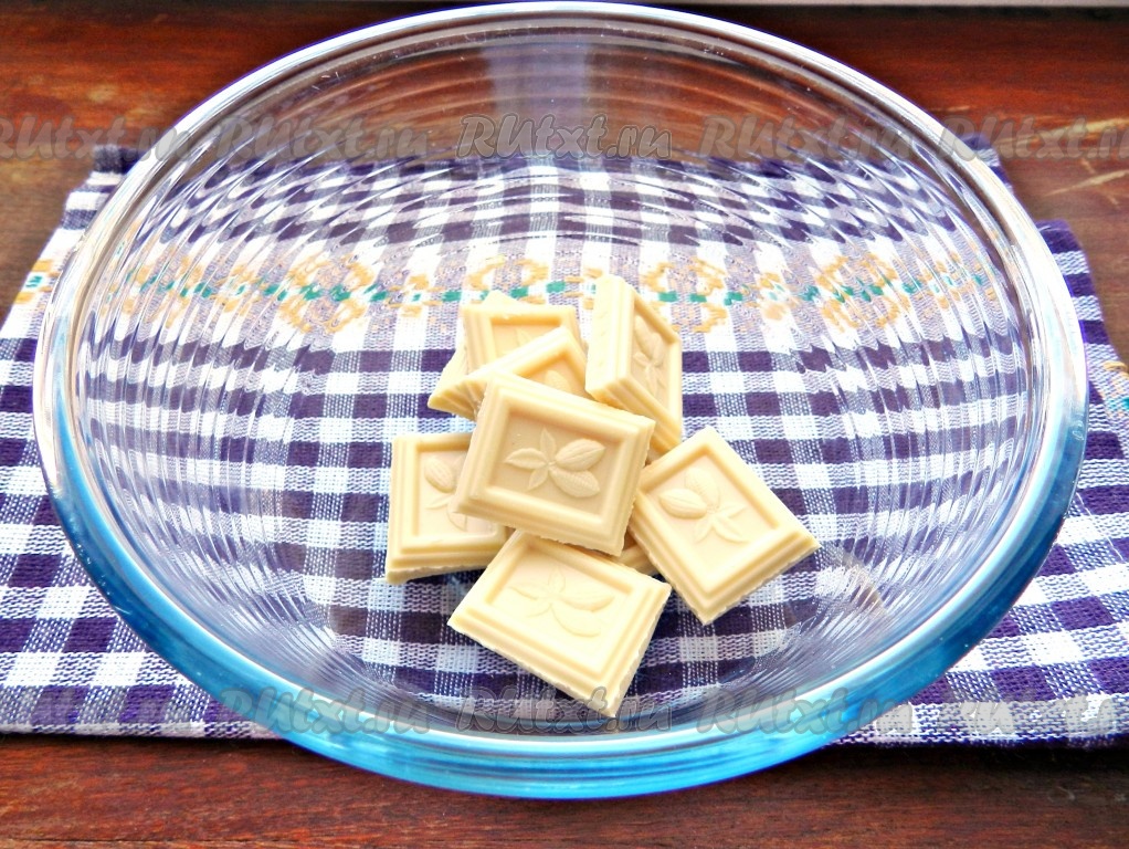 Для приготовления начинки нужно в миску выложить белый шоколад, поломанный на кусочки (или влить сгущёнку).