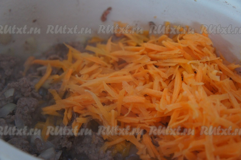 По истечении времени к фаршу с луком выложить морковь, натёртую на крупной терке, хорошо перемешать, оставить тушиться под крышкой на среднем огне на 7-8 минут (до мягкости моркови), не забывая время от времени помешивать.