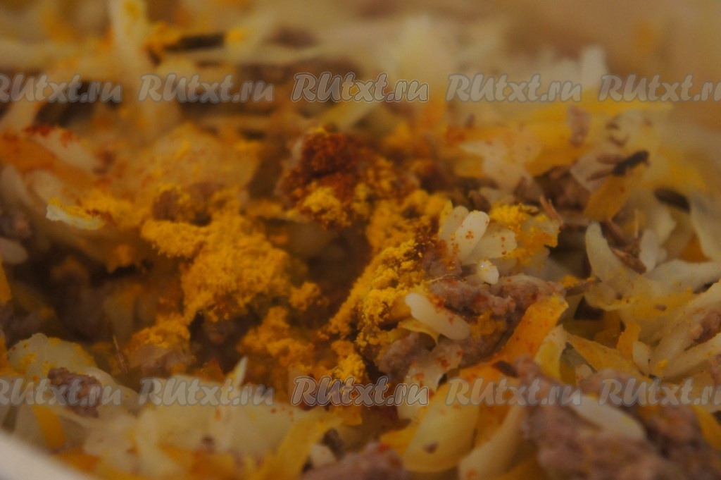 Всыпать специи (я добавила по щепотке паприки, куркумы и зиры), при необходимости, ещё посолить, перемешать и оставить тушиться ленивые голубцы с говяжьим фаршем под крышкой на 5-7 минут (капуста и рис должны стать мягкими, но не перевариться). Не забывайте иногда перемешивать.