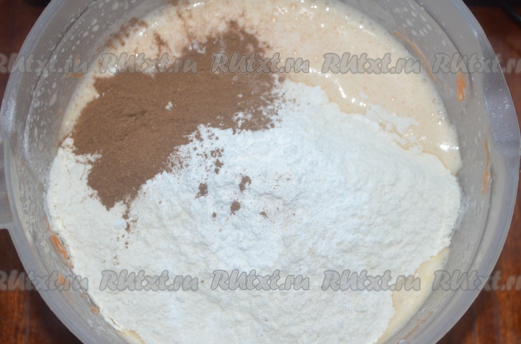 В получившуюся смесь просеять 150 грамм муки вместе с разрыхлителем и корицей, перемешать лопаткой, вмешивая полностью в тесто. Частями добавляя оставшуюся просеянную муку, замесить однородное тесто, напоминающее сметану средней густоты. Как только добились нужной густоты теста, значит больше муку добавлять не нужно.