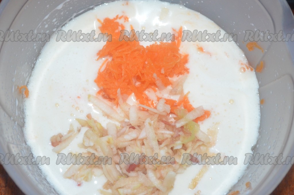 Яйца с сахаром, солью и ванилином взбить миксером на максимальных оборотах в течение 4-5 минут (смесь в процессе взбивания побелеет и увеличится в объёме). Во взбитую яичную массу влить подсолнечное масло, перемешать миксером. 200 грамм тыквы, очищенной от кожуры и семечек, натереть на мелкой тёрке, отжать от лишнего сока. Яблоко, очищенное от кожуры и семечек, натереть на крупной тёрке. Добавить тыкву и яблоко в смесь яиц и масла, перемешать лопаткой.