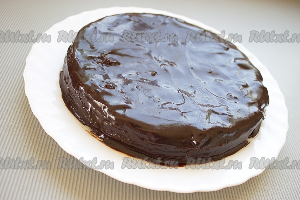 Тёплую заливку вылить сверху на корж и равномерно распределить по поверхности и боковинам коржа (удобно делать силиконовой лопаточкой или широким ножом). Дать торту полностью остыть, а заливке застыть (в холодильник ставить не надо!).