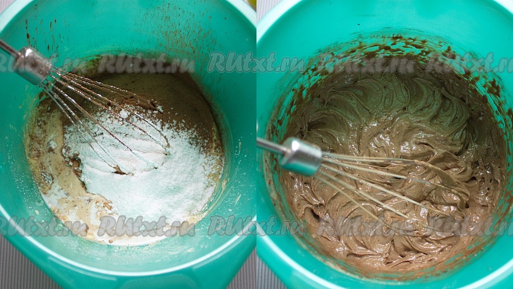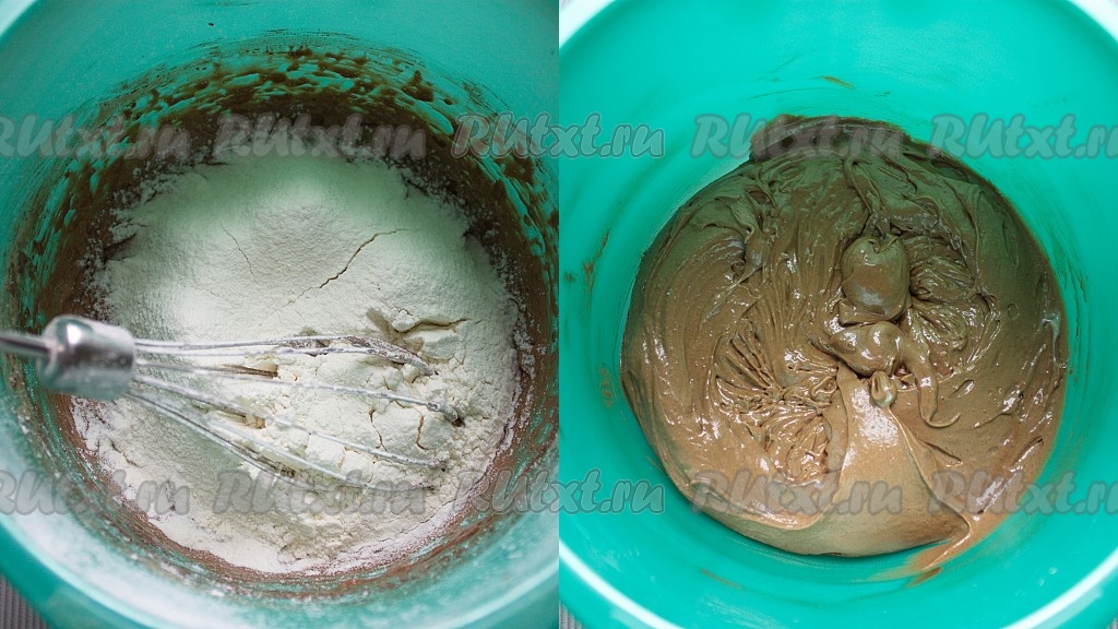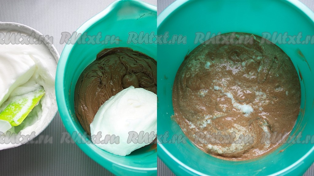 Белки отдельно взбить миксером до устойчивых пиков и частями добавить в тесто, аккуратно перемешивая силиконовой лопаткой (или ложкой). Шоколадное тесто должно получиться воздушным, однородным, не очень густым.