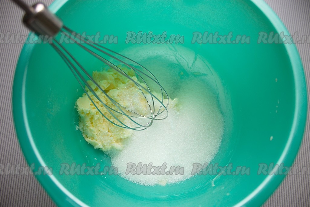 Прежде всего замесим тесто. Для этого размягчённое сливочное масло (для того чтобы масло стало размягчённым, его нужно заранее достать из холодильника, оно постепенно согреется и станет мягким) и сахар нужно взбить миксером до пышной консистенции.
