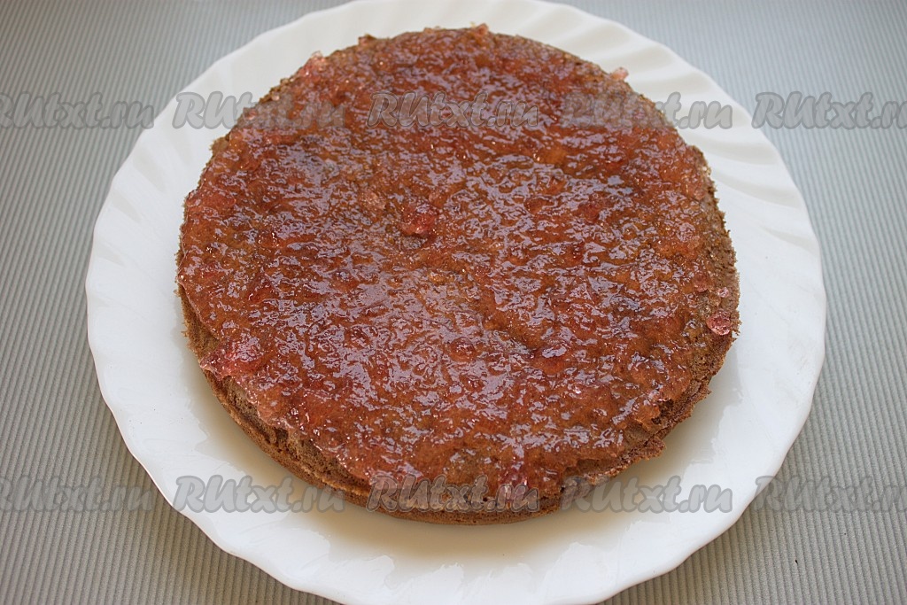 Абрикосовый мармелад (у меня не было, я заменила 2 столовыми ложками яблочного варенья и 30 граммами бутербродного мармелада) нагреть (можно нагреть в микроволновке или на плите) и равномерно смазать поверхность коржа. Если вы увеличиваете норму ингредиентов для коржа, тогда его желательно разрезать на 2 отдельных коржа и промазать ещё между собой.