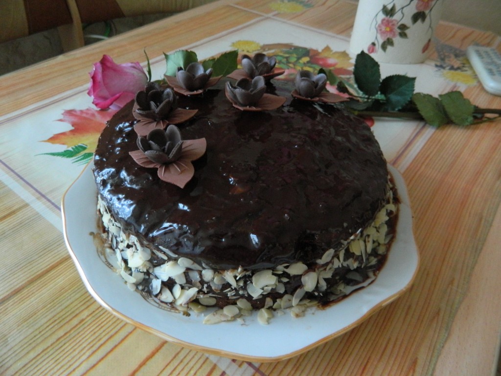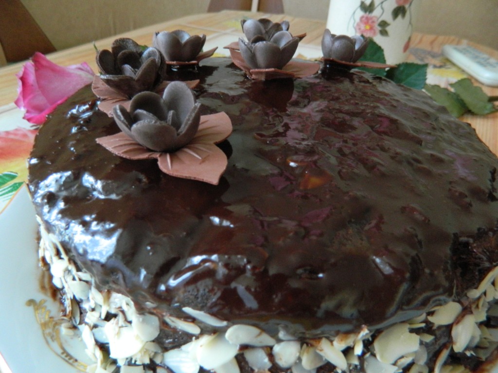 Немного дополняю рецепт. Добавляю в смесь 1 столовую ложку рома, 1 чайную ложку миндальной эссенции и 1 столовую ложку воды. Взбиваю в крепкую пену 4 белка и осторожно соединяю с шоколадной смесью. C шоколадом идеально сочетаются апельсин и абрикос.