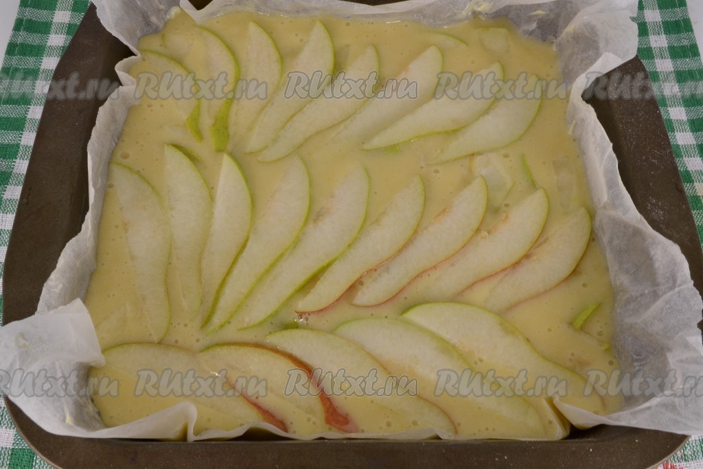 Форму застелить пергаментной бумагой, смазать хорошо размягченным сливочным маслом и присыпать мукой. Вылить тесто. Груши очистить, удалить семена. Две груши порезать небольшими кубиками, выложить сверху на тесто и ложкой придавить кусочки, чтобы они оказались покрыты тестом. Оставшуюся грушу порезать тонкими пластинами и разложить сверху.