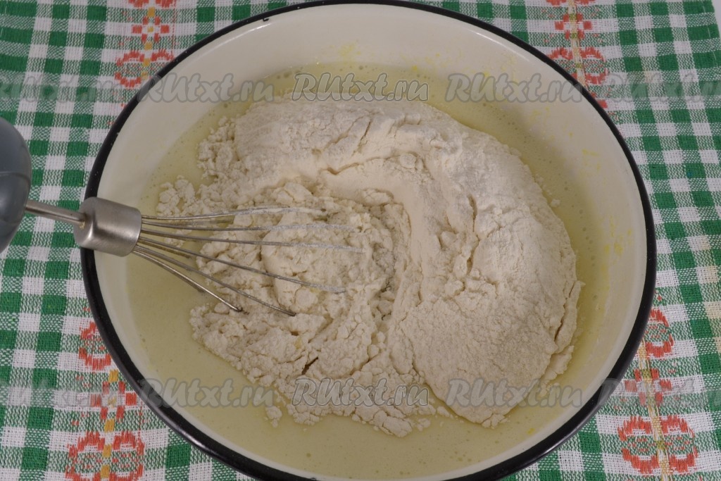 Затем всыпать просеянную с разрыхлителем муку и хорошо все перемешать.