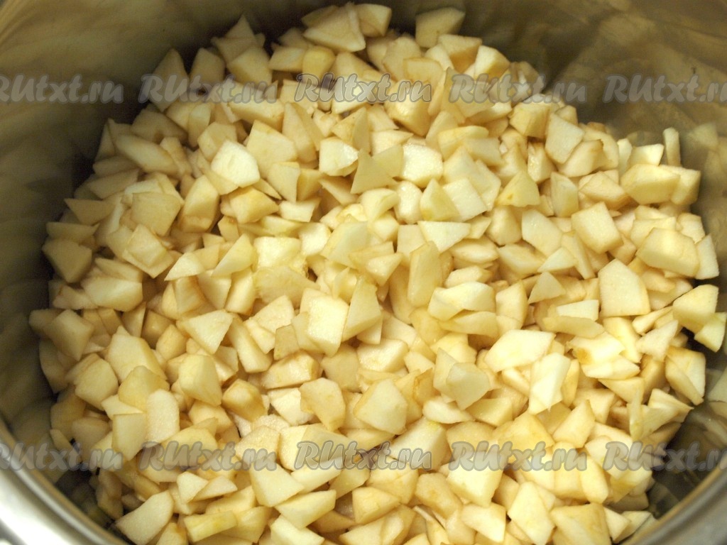 Яблоки, нарезанные маленькими кубиками (как на фото), перекладываем в большую кастрюлю, добавляем 50 мл воды, лимонный сок и варим 8-10 минут до мягкости яблок.