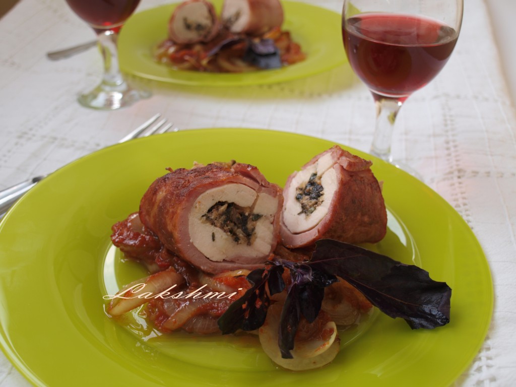 Ветчину тонко нарезаем. Куриное филе заворачиваем в ломтики ветчины. Для того чтобы рулетики при жарке не развалились, их можно для надёжности обвязать нитью или сколоть зубочистками. Убираем куриные рулетики в ветчине в морозилку минут на 30. За это время можно приготовить соус. Мелко нарезаем помидоры, очищенные от кожуры. Лук нарезаем тонкими полукольцами. Лук слегка обжариваем на растительном масле, затем добавляем помидоры, соль, перец и тушим минут 10-15 до мягкости помидоров.