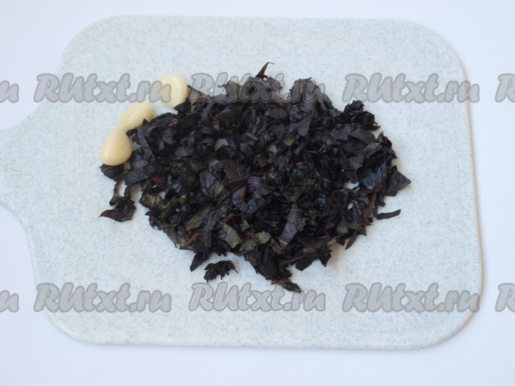 Мелко нарезанный базилик растираем в ступке с порубленным чесноком и мелко порезанными грецкими орехами и солью (при желании можно не растирать в ступке, а перемолоть в блендере).