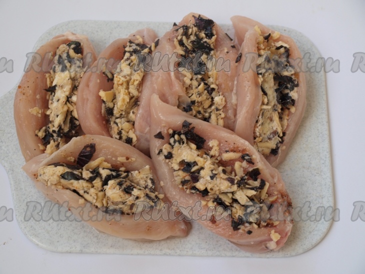 Разделяем куриное филе на порционные кусочки и в каждом филе делаем кармашек, солим и перчим.