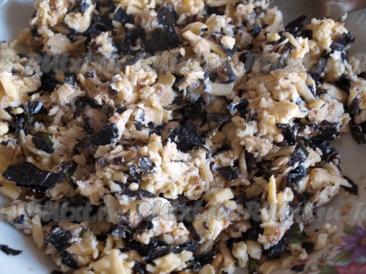 Сыр натираем на тёрке и тщательно перемешиваем со сливочным маслом до однородной массы, затем добавляем смесь из орехов, базилика и чеснока. Ещё раз перемешиваем.