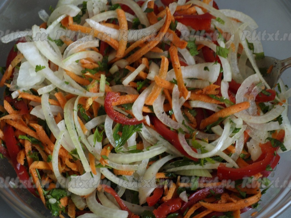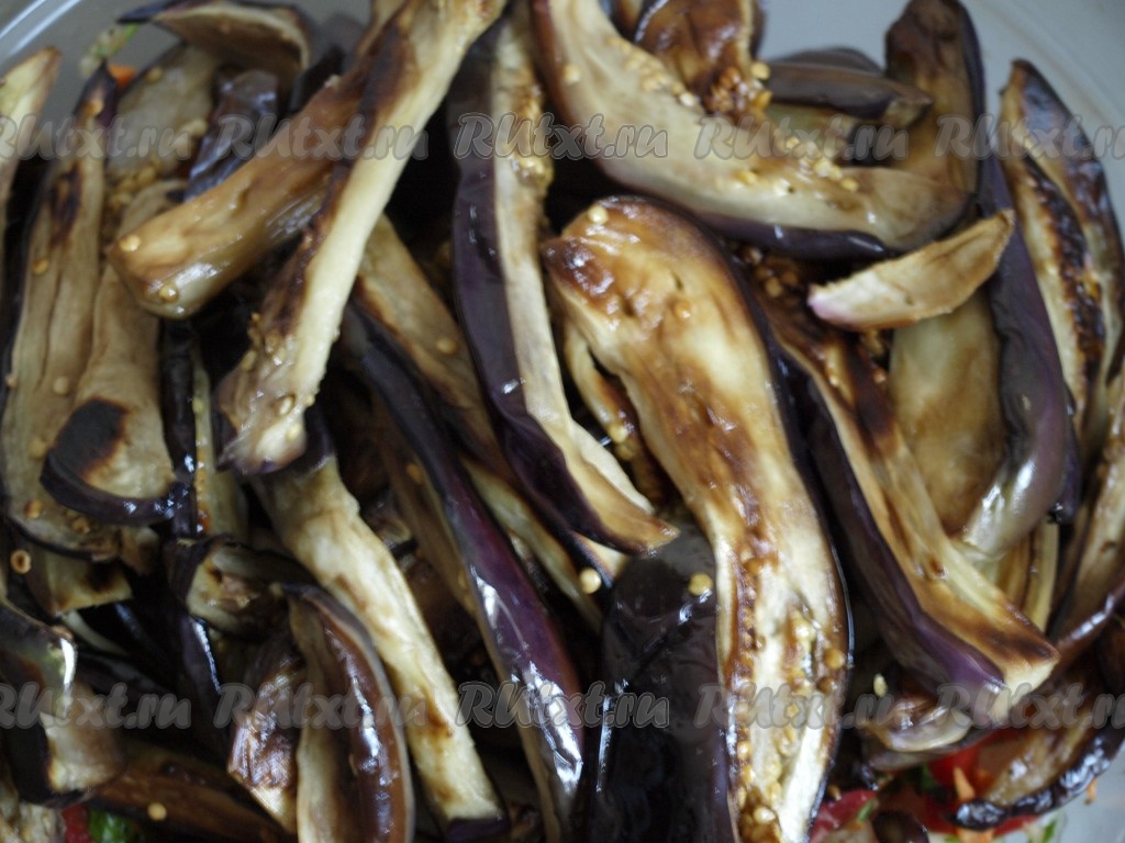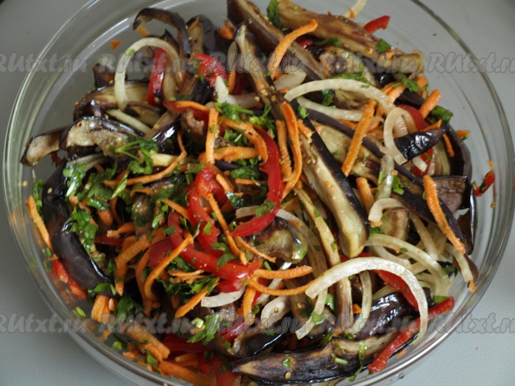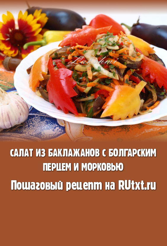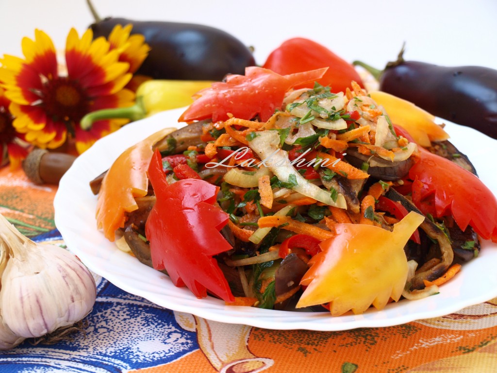 Салат, приготовленный из баклажанов с болгарским перцем и морковью, получается очень ярким, вкусным и аппетитным!